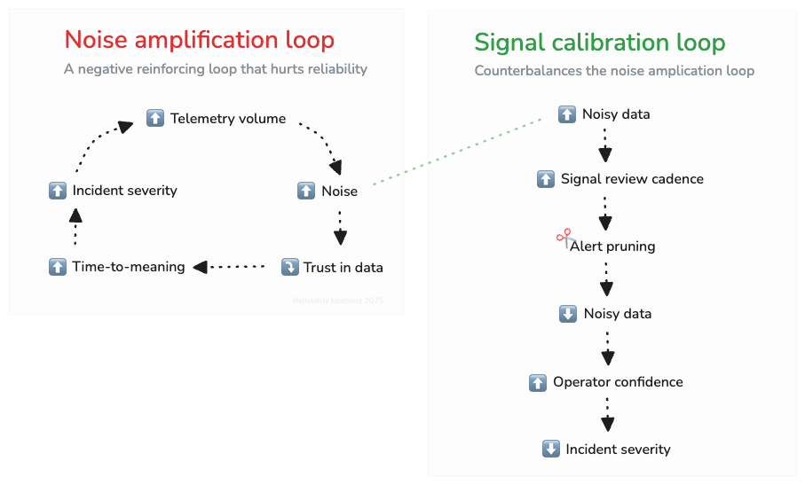 Small interventions like taking the time to prune unhelpful alerts can have an outsized impact in the long run because they restore the balancing loop between data and actionability.